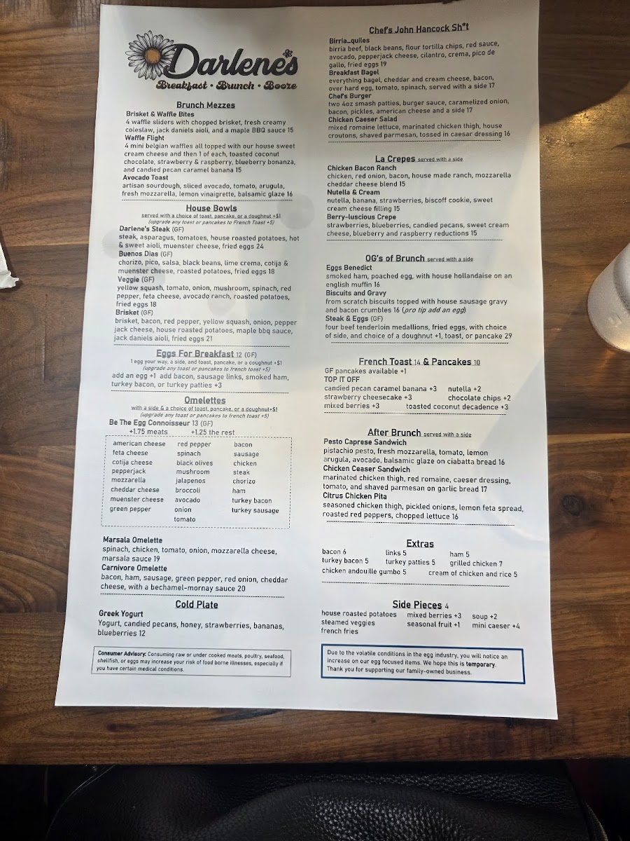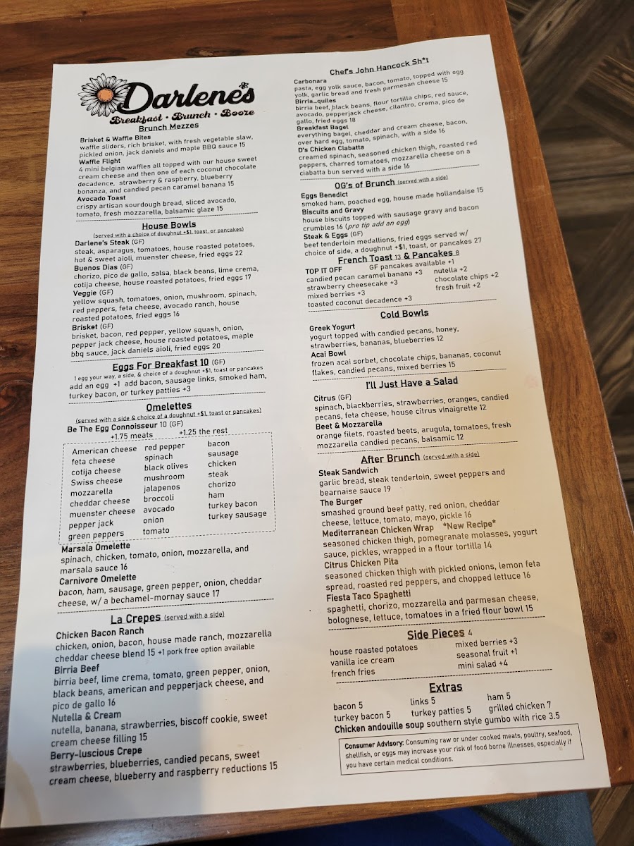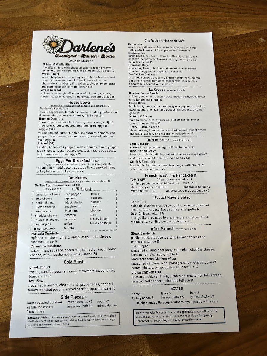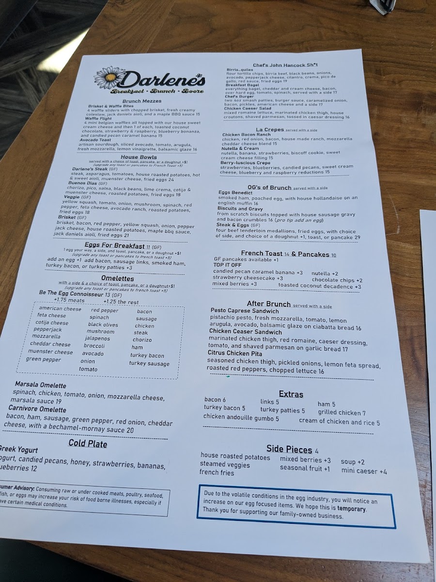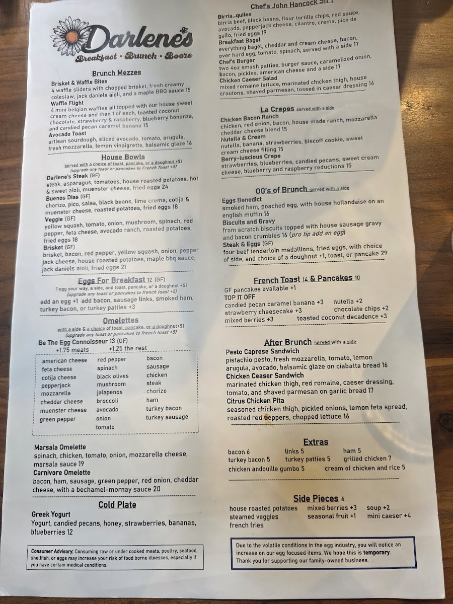 At Darlene's, the emphasis is on creating a menu that bursts with creativity while celebrating the classic favorites we hold dear. You can expect a vibrant variety to suit every palate. Picture yourself savoring the Buenos Dias House Bowl, where chorizo dances with freshly prepared pico de gallo and a burst of lime crema, complemented by house-roasted potatoes—all crowned with perfectly fried eggs. Or try the Brisket House Bowl, which brings together succulent brisket, smoky bacon, and a medley of vegetables, all elegantly drizzled with maple BBQ sauce and Jack Daniel's aioli. Each bite is a delightful embrace of flavors that will set the mood for your day.